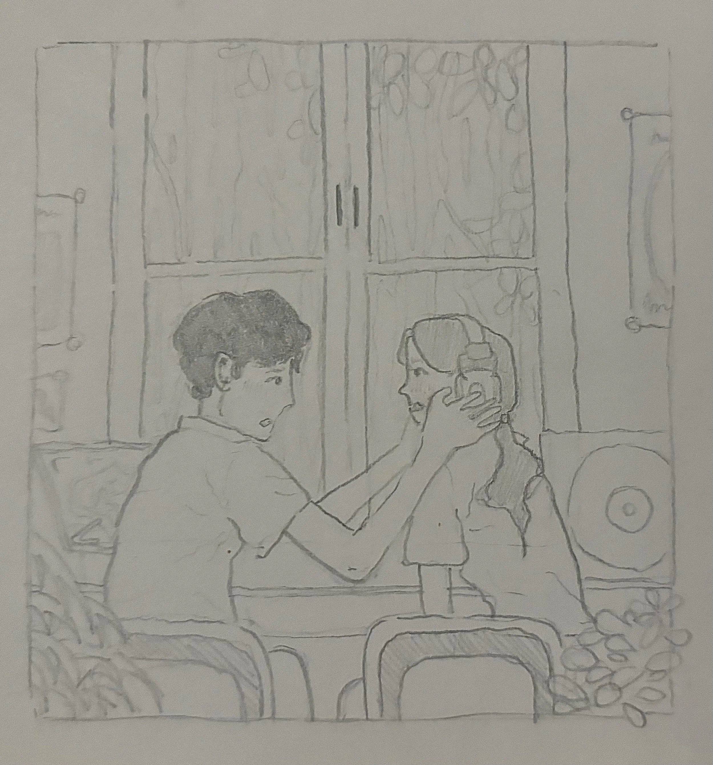 These sketches delicately capture moments of human connection and intimacy, frozen in time. The hands reaching for one another, reminiscent of a timeless gesture, symbolize yearning, closeness, and the invisible bond between two souls. A quiet exchange between two figures by a window speaks to the warmth of companionship, their expressions suggesting unspoken words of comfort. The couple, mid-dance, exude a tenderness and simplicity in their shared movement, embodying a carefree, fleeting joy. Each image holds a story of closeness and emotion, drawn with sensitivity and grace, inviting the viewer into the quiet beauty of everyday moments.
