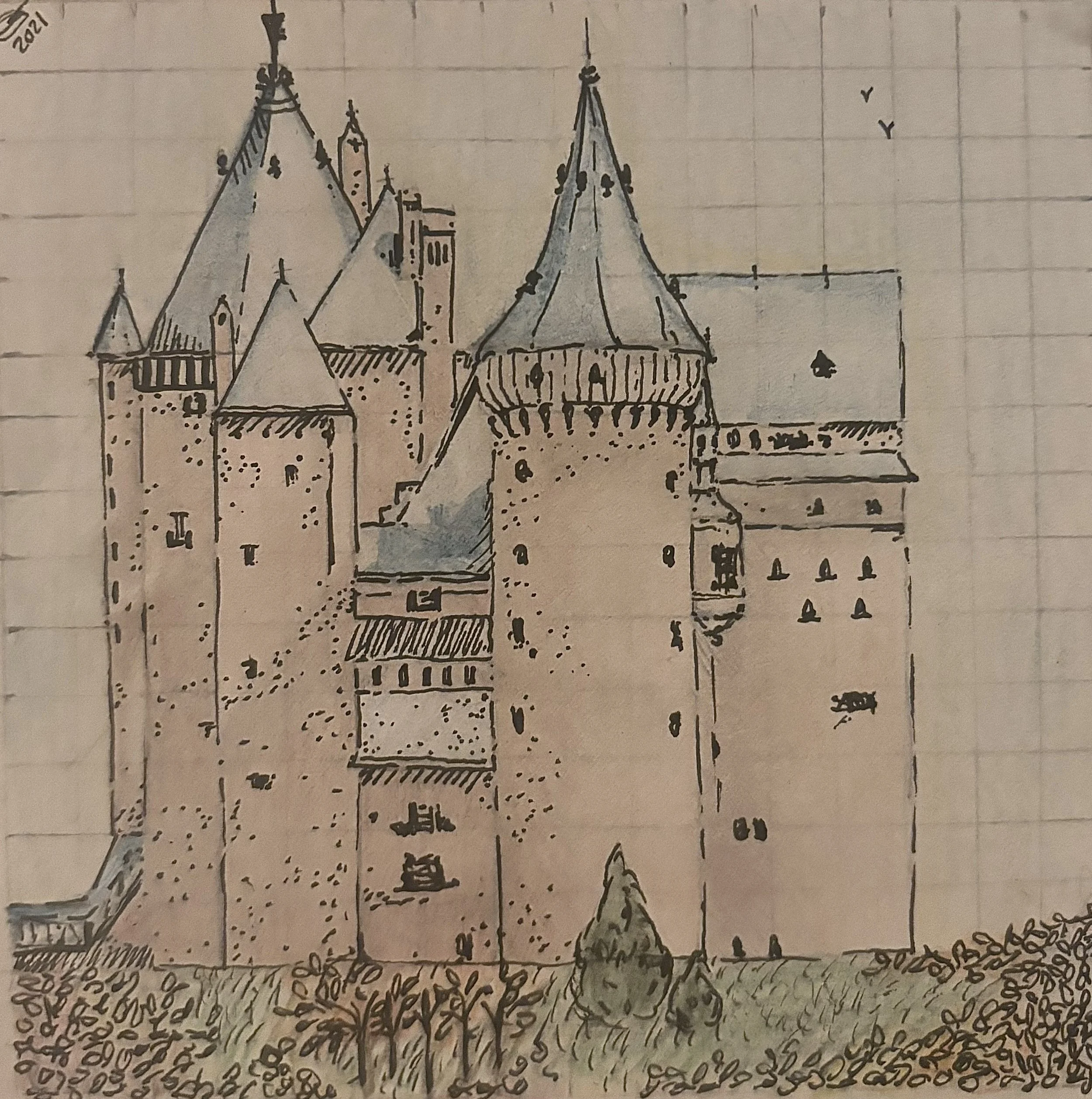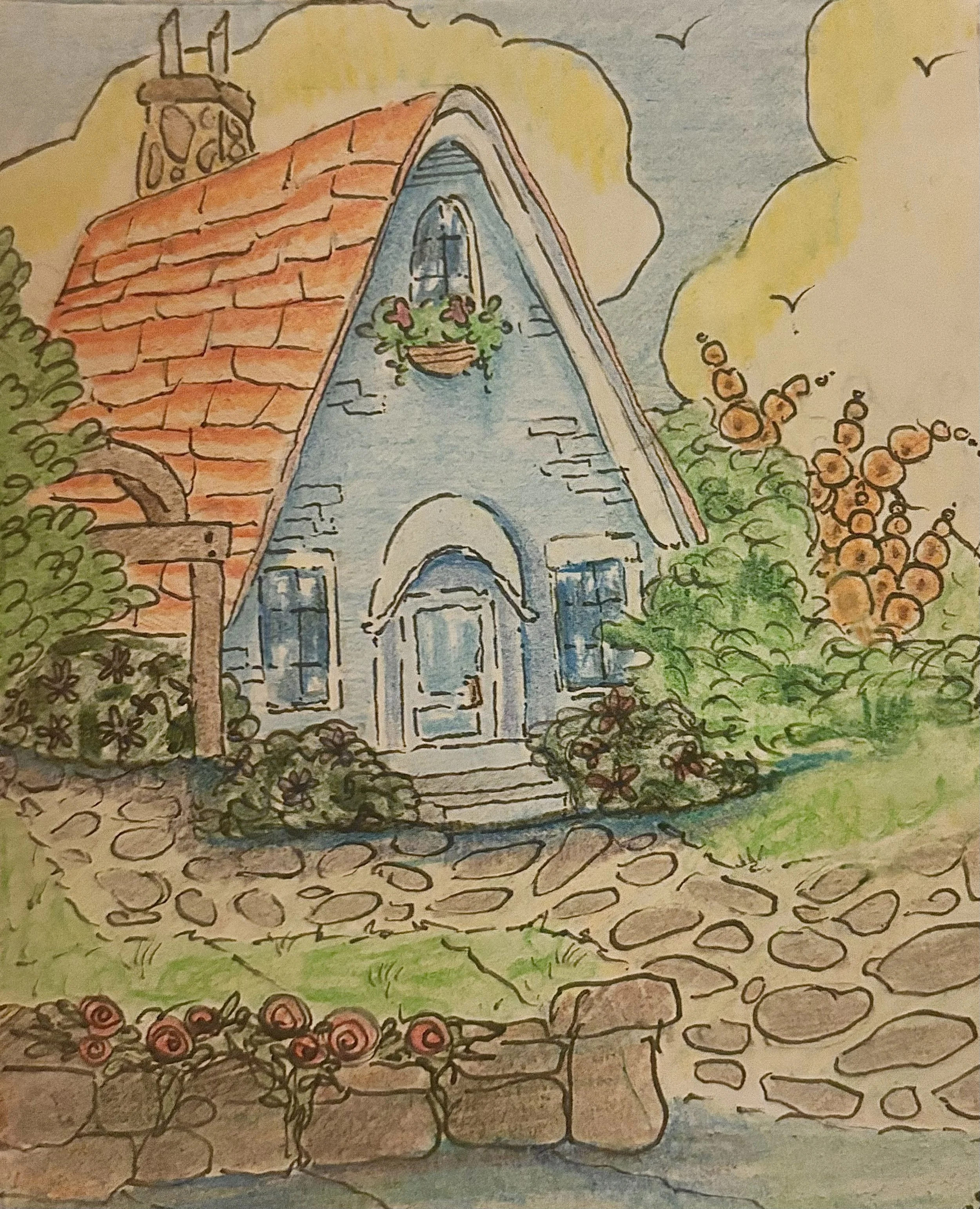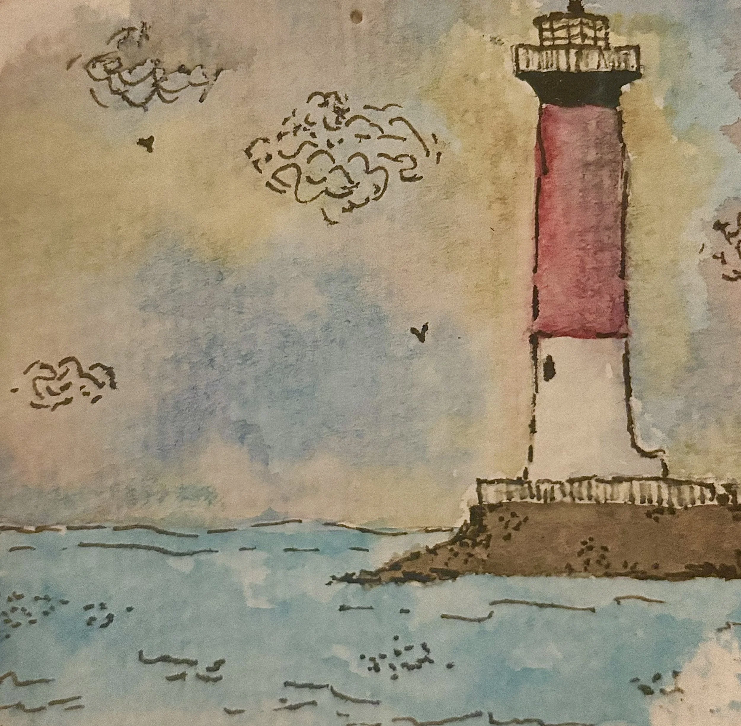 Serene colorful landscapes with a whimsical lighthouse, an intricate ink-and-watercolor castle, and enchanted cottages rich in detail and structure.